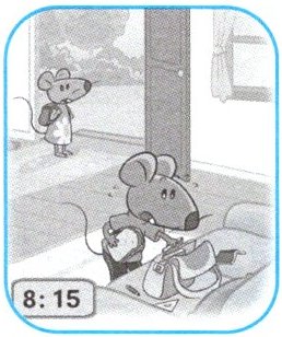 In the morning, I have breakfast at seven forty. I go to school at eight o'clock. I have three lessons in the morning. At ten thirty, it's break time. I can play outside.