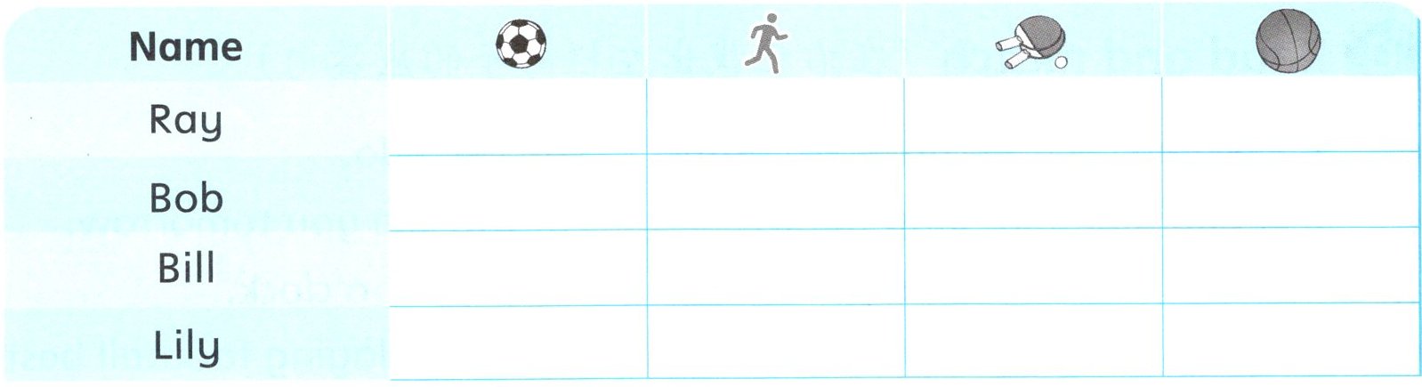 1. Ray: football, basketball Bob: football Bill: ping-pong Lily: running, ping-pong