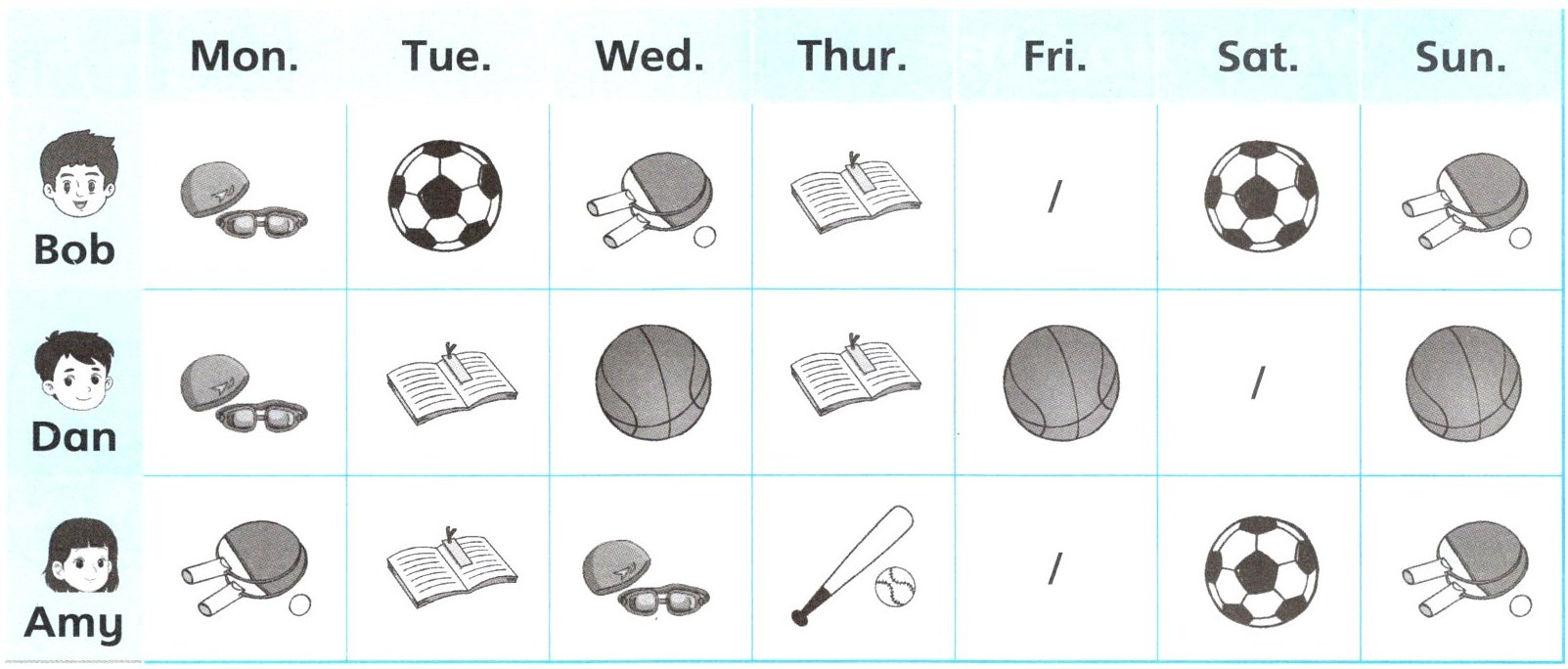 ☺ 1. Bob and Dan swim on Monday.