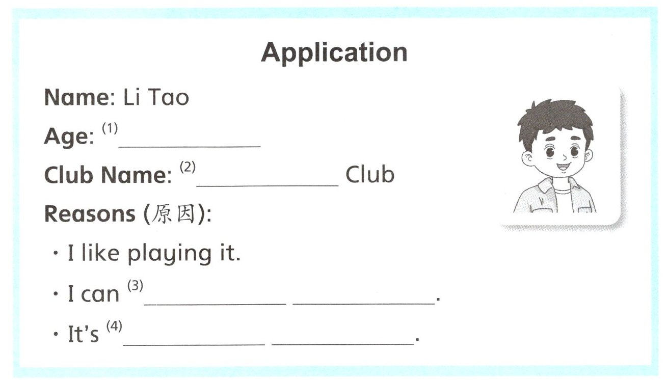 E Listen and write(听录音,完成申请表,每空一词)