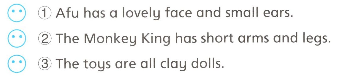 Look! My doll is a clay Monkey King. He has yellow hair. His eyes are big. His arms and legs are long. He is great!