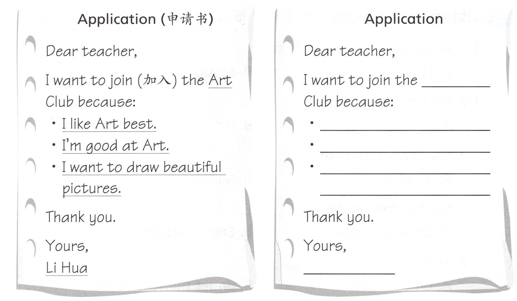 E Read and write (学校社团正在招募新成员, 请仿照例子, 完成你的申请书) 选做题