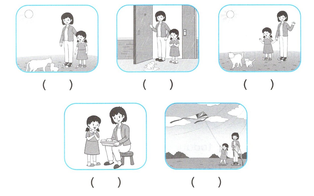 It is rainy in the afternoon. Lily and her mum see a little cat at the door. They make a bed for the cat. At four o'clock, it is sunny and warm. They take the cat outside. The little cat finds her mum. They say goodbye to Lily and her mum.