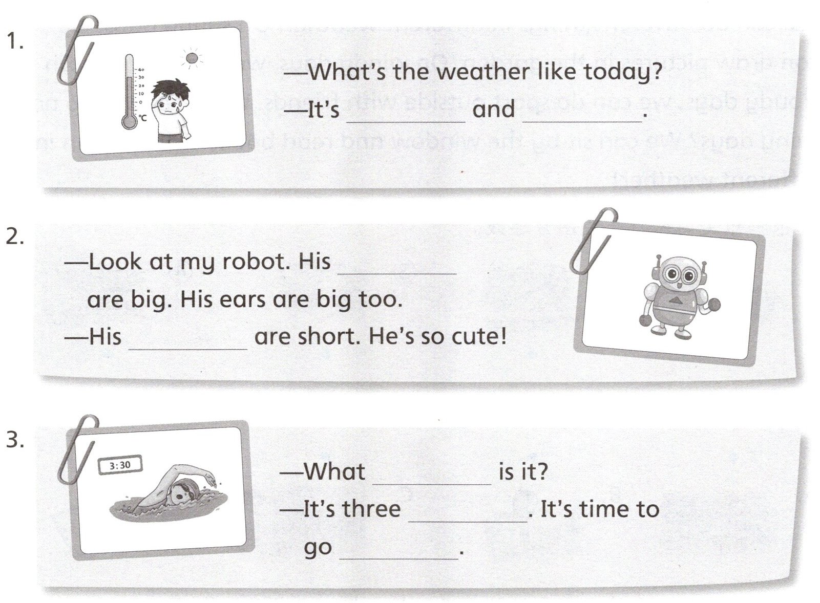 1. sunny, hot 2. eyes, legs 3. time, thirty, swimming