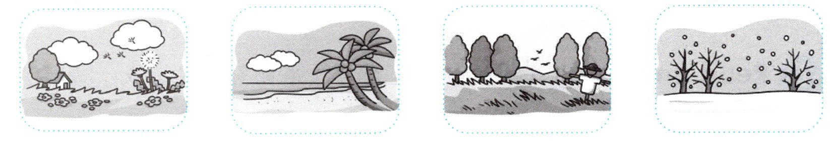 1. winter, snow 2. spring, trees 3. autumn 4. ice cream, summer