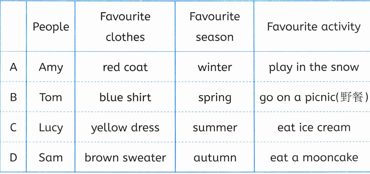 Task 1. Read and match. 读一读,将表格中的选项与人物匹配。(4分)