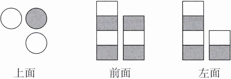 桌子上有一些叠起来的棋子,棋子分两种颜色。分别从上面、前面和左面三个方向观察这些棋子,看到如下图形。一共有(