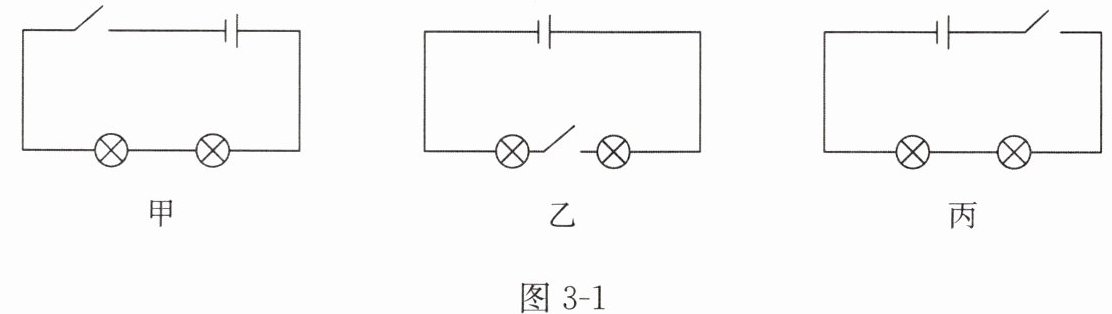 3. 改变开关在电路中的位置,如图 3 - 1 乙和图 3 - 1 丙所示,分别闭合、断开开关,观察开关控制两个小灯泡的情况是否有变化。