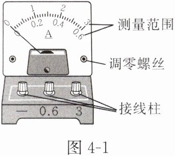 1. 电流表如图 4-1 所示,图上分别标注了测量范围、调零螺丝、接线柱。接线柱旁的数字对应表盘刻度上测量范围的