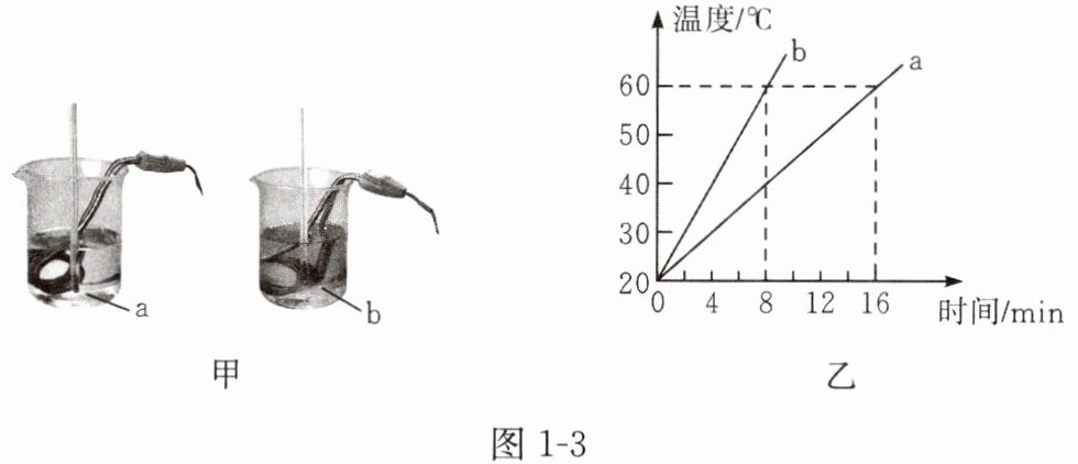 某同学利用图 1 - 3 甲所示的装置比较不同物质的吸热情况,他将质量相等的两种液体分别装在两个相同的烧杯中,用两个规格均为500 W的电加热器加热,并每隔2 min记录一次温度。图 1 - 3 乙是他根据实验数据绘制的图像。