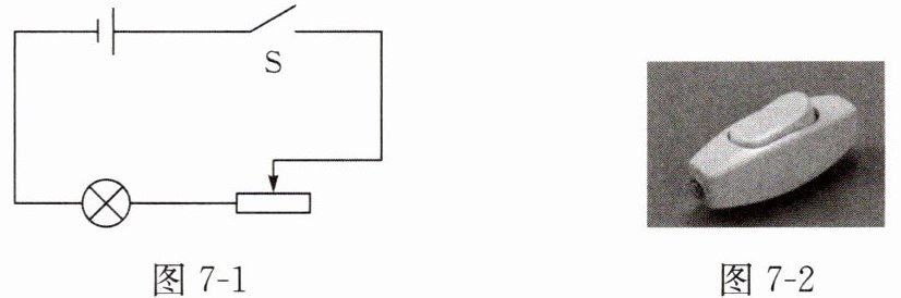 1. 设计电路,选择器材:可采用如图 7 - 1 所示的电路图。光源选择小灯泡或发光二极管均可。在条件允许的情况下,建议选择正常工作电压为 2.5 V 左右的发光二极管,因为与同规格的小灯泡相比,二极管更亮,也更节能。开关可选择如图 7 - 2 所示的手捏开关。