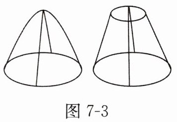 4. 根据设计方案制作灯罩:可将金属丝按照如图 7 - 3 所示,做成圆锥形或圆台形框架,在框架上部做一个小灯泡的支架。然后用胶布将彩色包装纸覆盖在框架上,做成灯罩。