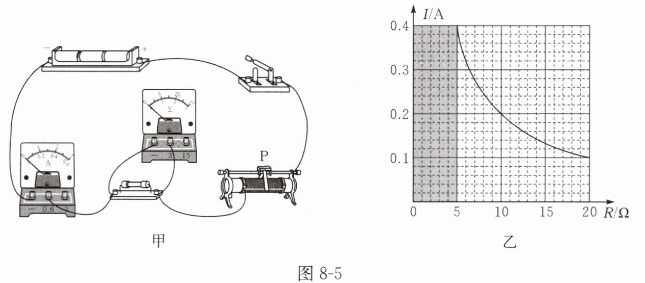 (3) 由图 8 - 5 乙可知,图线上的任一点和坐标轴围成的矩形的面积的大小等于电流与电阻的乘积,而所有矩形的面积都相等,说明通过导体的电流与导体的电阻的乘积保持不变,故可得出结论:导体两端的电压一定时,通过导体的电流与导体的电阻成反比。