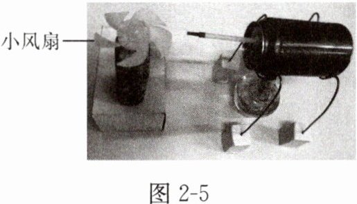 4. 将易拉罐放在支架上,调整风扇的高度,使笔的尖端对准小风扇的扇叶。将酒精灯放在易拉罐下面,点燃酒精灯,当有水蒸气喷出时,扇叶就会转动,如图 2 - 5 所示。