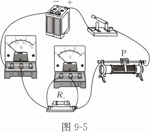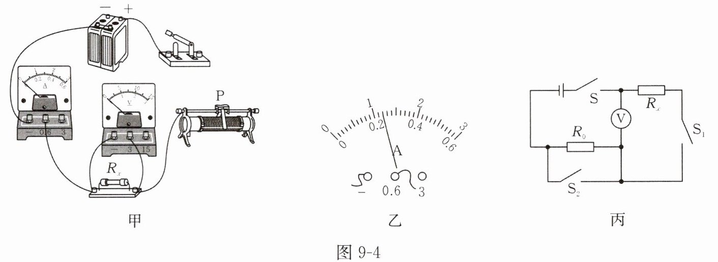 (2)由图 9 - 4 乙可得,电流表的测量范围为 $ 0\sim0.6\ A $,分度值为 $ 0.02\ A $,所以其示数为 $ 0.24\ A $。由欧姆定律可得,待测电阻的阻值为 $ R_{x}= \frac{2.4\ V}{0.24\ A}= 10\ \Omega $。