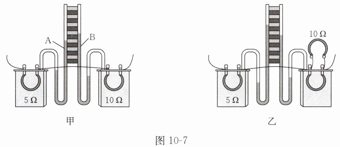 例题 2 某同学用如图 10 - 7 所示的实验装置探究“电流通过导体时产生的热量与哪些因素有关”,两个透明容器中密封着电阻丝和等量的空气。