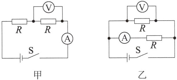 9. 如图所示,甲、乙两图中电源两端电压相同,且各定值电阻的电阻相等。其中,甲图中电流表的示数为 $ I_甲 $,电压表的示数为 $ U_甲 $;乙图中电流表的示数为 $ I_乙 $,电压表的示数为 $ U_乙 $。当开关都闭合时,下列判断正确的是(