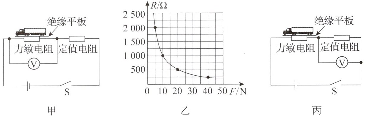 (2) 图甲中力敏电阻与定值电阻串联,电压表测力敏电阻两端电压。货车质量越大,压力 $ F $ 越大,由图乙知力敏电阻 $ R $ 越小。根据串联分压规律 $ \frac{U_{力敏}}{U_{定值}}=\frac{R}{R_{定}} $,$ R $ 减小则力敏电阻分压减小,电压表示数越小。