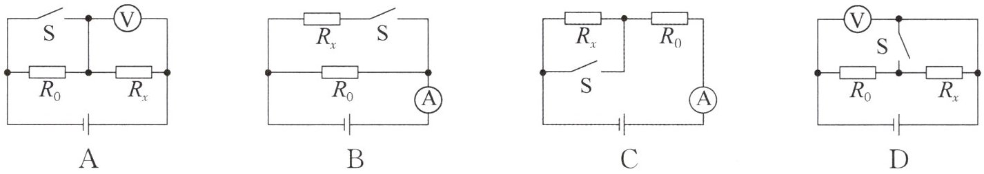 12. 在测量电阻$R_x约为5 \Omega$的定值电阻的实验中,小红在实验室所提供的器材中选择合适的器材,设计电路测出该定值电阻的电阻。如图所示的四个电路中,已知另一定值电阻的电阻为$R_0$,不能测出电阻$R_x$的电路是(