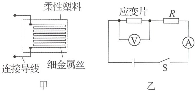13. 将一根细金属丝置入柔性塑料中,可以制成用来检测物体形变的器件应变片,其结构如图甲所示。将它接入如图乙所示的电路中,电源电压不变,定值电阻的电阻为$R$。闭合开关S,当应变片随被检测物体发生拉伸形变时,塑料中的金属丝会被拉长变细,导致电阻变大,则电路中的(