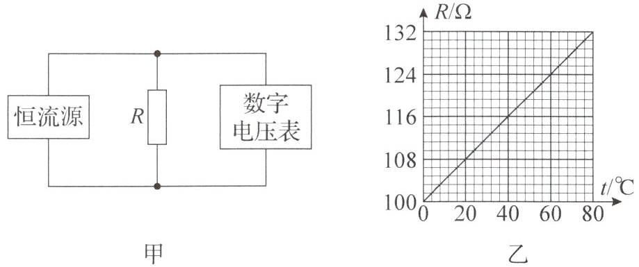 14. 某自动气象站中的测温装置的测温电路可简化为图甲所示电路,其中“恒流源”是一个特殊电源,电流大小由电源内部结构决定,可以使通过热敏电阻的电流大小保持不变。热敏电阻的电阻$R$随温度的变化规律如图乙所示。某次环境温度从$20^{\circ}C上升到30^{\circ}C$,电压表的示数变化了$8 mV$。当温度的变化值相同时,电压表的示数的变化值越大,该测温装置的灵敏度越高。下列说法正确的是(