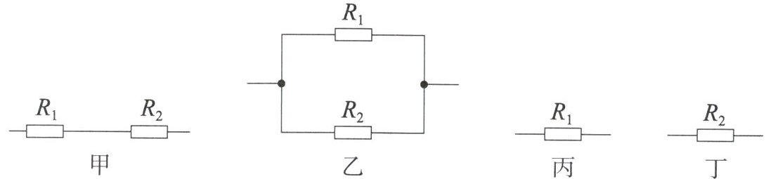 5. 现有两个电阻分别为$R_1和R_2$($R_1 < R_2$)的定值电阻,按照如图所示的四种方式,分别接到电压恒为$U$的电源两端工作相同的时间。四个电路中电流做功的大小关系正确的是(