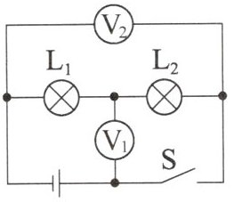 9. 如图所示,电源电压保持不变,开关$S$闭合后,小灯泡$L_1$、$L_2$都能正常发光。若$V_1$、$V_2$两个电压表的示数之比为3:4,则相同时间内小灯泡$L_1$、$L_2$消耗的电能之比是(