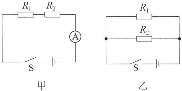 6. 已知两个定值电阻的电阻分别为$R_1= 2Ω、$$R_2= 3Ω,$如图所示,某同学分别按照甲和乙两种方式将两个定值电阻连接在一起,则(
