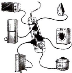 2.过载:电路中同时使用的用电器总功率过大,超过电路承载能力,引起跳闸。