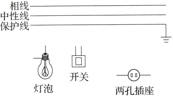 相线(火线)接入开关,从开关引出连接到灯泡的顶端接线柱。