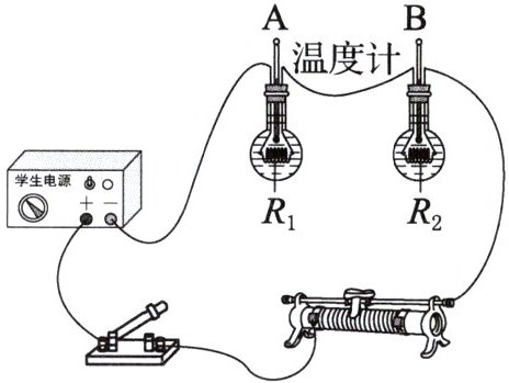 (4)若闭合开关一段时间后,温度计 A 的示数明显高于温度计 B 的示数,则可判断两电阻丝的电阻大小关系为 $R_1$