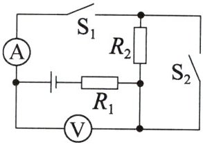 14. 如图所示的电路中,电源两端电压不变,定值电阻的电阻分别为 $R_1$、$R_2$。当仅闭合开关 $S_1$ 时,电流表示数为 $I$,电压表示数为 $U$,电路中的总电阻为 $R$,电路的总功率为 $P$;再闭合开关 $S_2$ 后,电流表示数为 $I'$,电压表示数为 $U'$,电路中的总电阻为 $R'$,电路的总功率为 $P'$。下列判断正确的是(