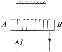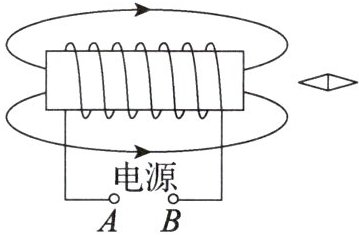 2. 电流方向:根据安培定则,右手握住螺线管,大拇指指向右端(N极),四指指向电流方向,可知螺线管左端导线电流向上,右端导线电流向下(电源左端为正极,右端为负极)。