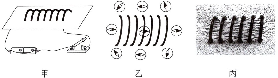 9. 小明想研究通电螺线管外部磁场的分布情况,他组装了如图甲所示的电路,然后在螺线管周围放置了一些小磁针,闭合开关后,小磁针的指向如图乙所示(小磁针黑色的一端为N极);将小磁针拿掉之后,在硬板上均匀地撒上一些铁屑,闭合开关后轻轻敲打硬板,可以看到铁屑的分布情况如图丙所示。