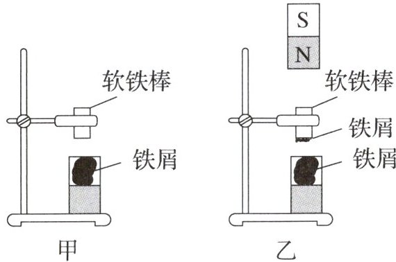 1. 小明利用如图所示的装置探究磁化过程,图中容器内装有一些铁屑,用铁架台将一根软铁棒固定在容器上方。比较甲、乙两图中的现象可知:当条形磁体靠近软铁棒时,软铁棒由于被