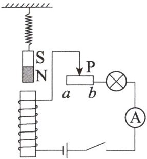 5. 如图所示,在电磁铁的正上方用弹簧悬挂一个条形磁铁,闭合开关后,将滑片P从a端向b端滑动的过程中,下列判断正确的是(
