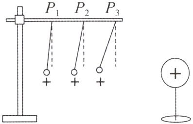 7. 小明将带正电的物体固定放置,再将一个带正电的小球系在绝缘线上,先后挂在$ P_1 $、$ P_2 $、$ P_3 $位置(静止后如图所示),比较小球偏离竖直线的角度。小明想研究的问题是(