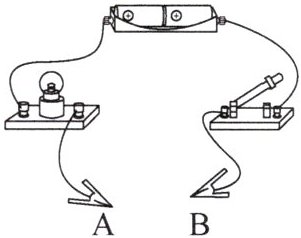 2. 小明用来鉴别导体与绝缘体的装置如图所示,在金属夹A、B之间分别接入①硬币、②铅笔芯、③橡皮、④塑料尺等物体,闭合开关后,在A、B间接入