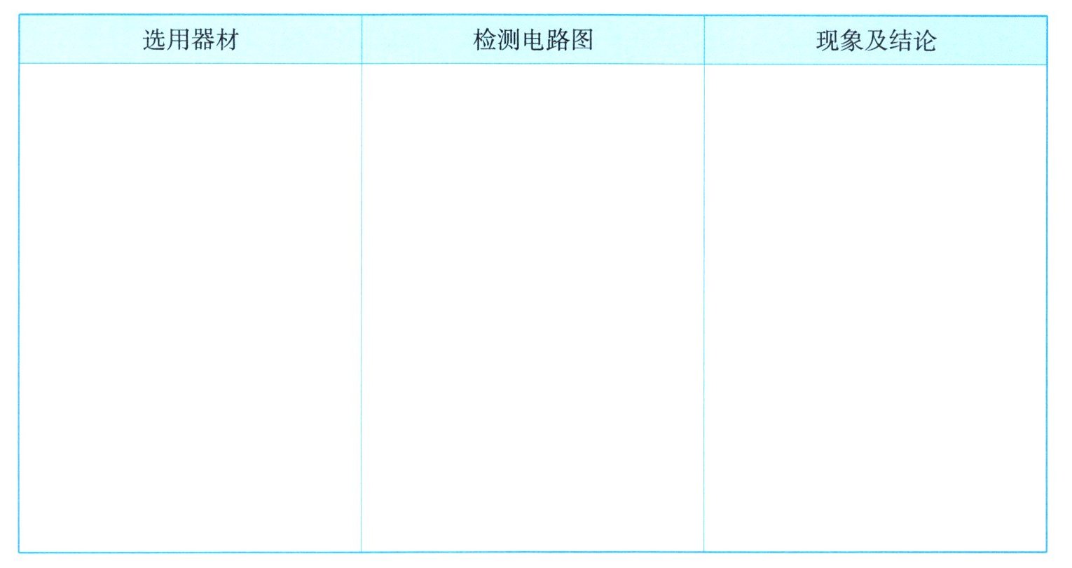 10. 小明在做连接串联电路的实验时,连好电路后,闭合开关,两个小灯泡均不亮,经检查,电路连接无误,老师告诉他原因是其中一个小灯泡坏了。请你帮助小明选用一种实验器材连入电路,检测哪个小灯泡坏了,并按下面表格的格式要求填入检测实验的内容。(可供选用的器材:导线、小灯泡。)