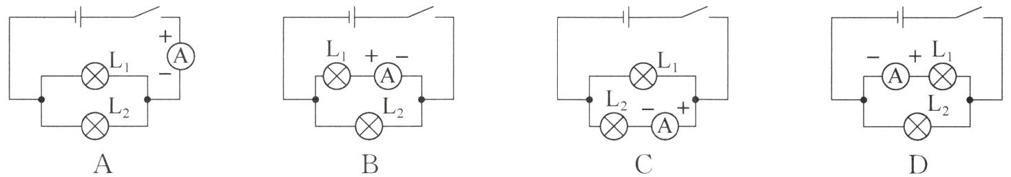 4. 如图所示的电路中,能直接测量通过小灯泡$ L_1 $的电流的电路是(