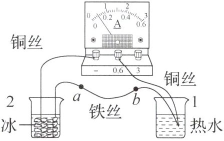 3. 如图所示,两种不同的金属丝组成一个闭合回路,触头 1 置于热水中,触头 2 置于冰中,此时回路中电流表的指针会向右偏转,这是温差电现象。此过程中铁丝内电流的方向为