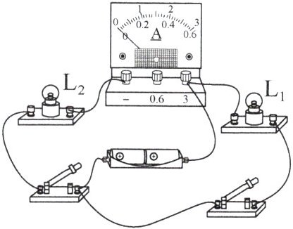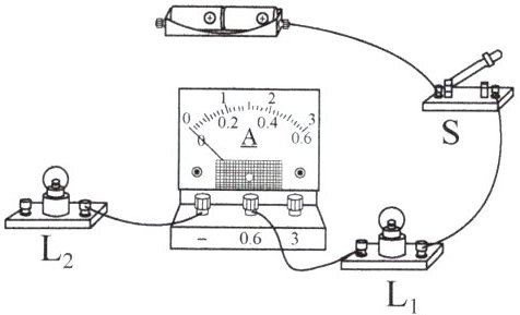 3. 从电流表的正接线柱(已用一接线柱接电源或与开关连接时对应)引接线考虑(图示电流表两个负接线柱-,0.6,3 选 0.6 接线柱为L1电流测量),从电流表 0.6A 接线柱引出一根导线连接到小灯泡$L_1$的另一个接线柱。