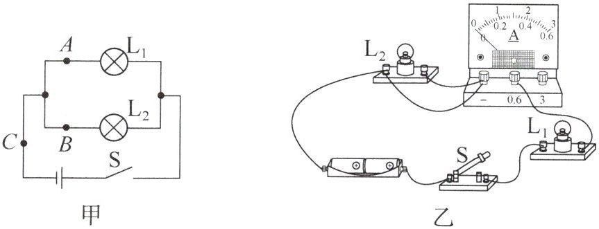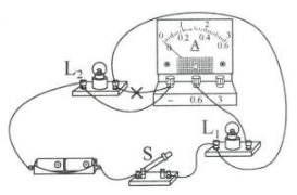 (在图乙中,将连接L₂右端与电流表正接线柱的导线画“×”,补画导线将L₂右端连接到电源负极或L₁与电流表串联后的汇合点,确保电流表串联在L₁支路中)