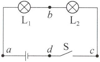 5. 如图所示,开关$ S $闭合后,小灯泡$ L_{1} $、$ L_{2} $都不亮,用一段导线的两端分别接触$ a $、$ b $两点时两小灯泡都不亮;分别接触$ b $、$ c $两点时,两小灯泡也不亮;分别接触$ c $、$ d $两点时,两小灯泡都亮。对此,下列判断中可能正确的是(
