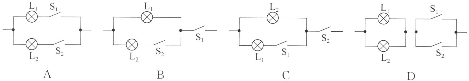 2. 老师给小龙一个密封盒,其表面可见两个开关$ S_{1} $、$ S_{2} $和两盏灯$ L_{1} $、$ L_{2} $。为了探究开关和灯在密封盒内是如何连接的,小龙进行了如下操作:先闭合$ S_{1} $,只有灯$ L_{1} $发光;又闭合$ S_{2} $,两灯都发光;最后断开$ S_{1} $,两灯都熄灭。下列图中符合上述实验结果的连接方式为(