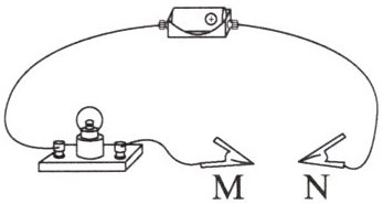 5. 如图所示,用导线把电源、灯泡连接起来,再依次把玻璃杯、竹筷、塑料笔杆、金属小勺等接到 M、N 两个夹子之间,其中能使灯泡发光的是