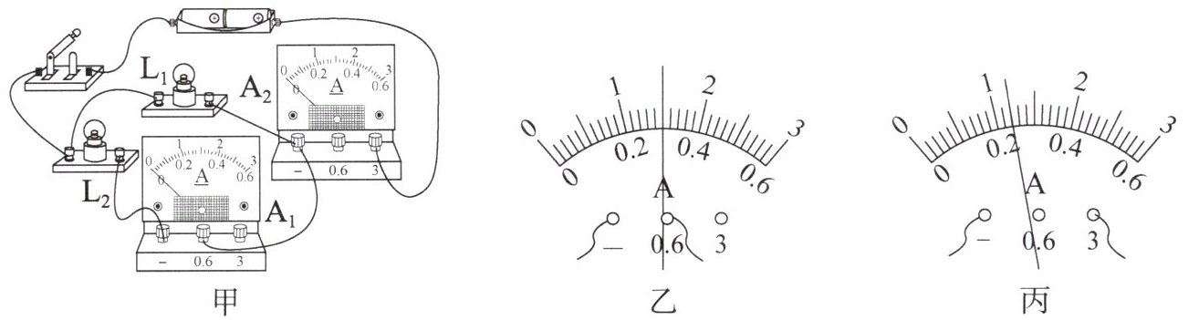 8. 如图甲所示的实物电路中,当开关闭合时,电流表$ A_1、$$A_2 $的指针偏转分别如图乙、丙所示,则通过灯$ L_1 $的电流为