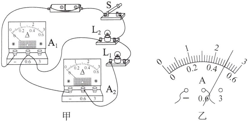 15. (多选)小明连接了如图甲所示的电路,当他闭合开关后,发现两灯正常发光,电流表$ A_1 $的示数为 0.9 A,电流表$ A_2 $的指针偏转情况如图乙所示。下列说法正确的是(