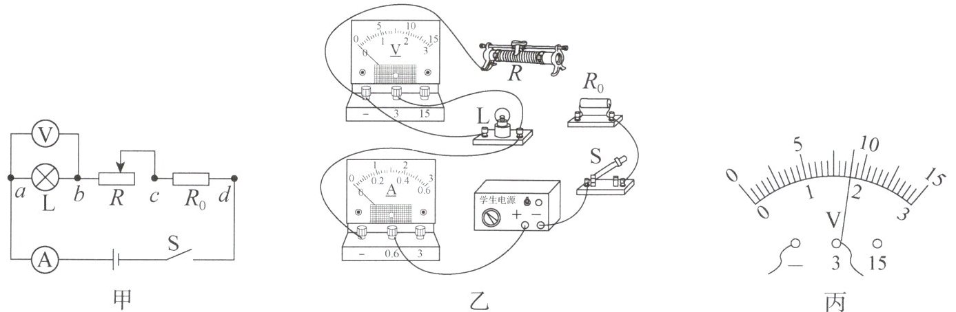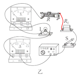 根据图甲电路图,将图乙实物图连接如下:电源正极 → 开关S → 滑动变阻器R(滑片右端接电源,左端接R₀) → 定值电阻R₀ → 电流表A → 电源负极。电压表并联在L两端(a与b)、L与R之间(b与c)等,按题目要求连接,确保导线不交叉。