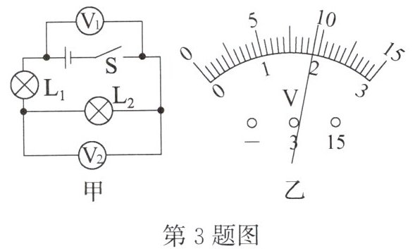 3. 如图甲所示的电路中,若开关闭合后,两电压表的指针均如图乙所示,则电路中$L_1$和$L_2$两端的电压分别为